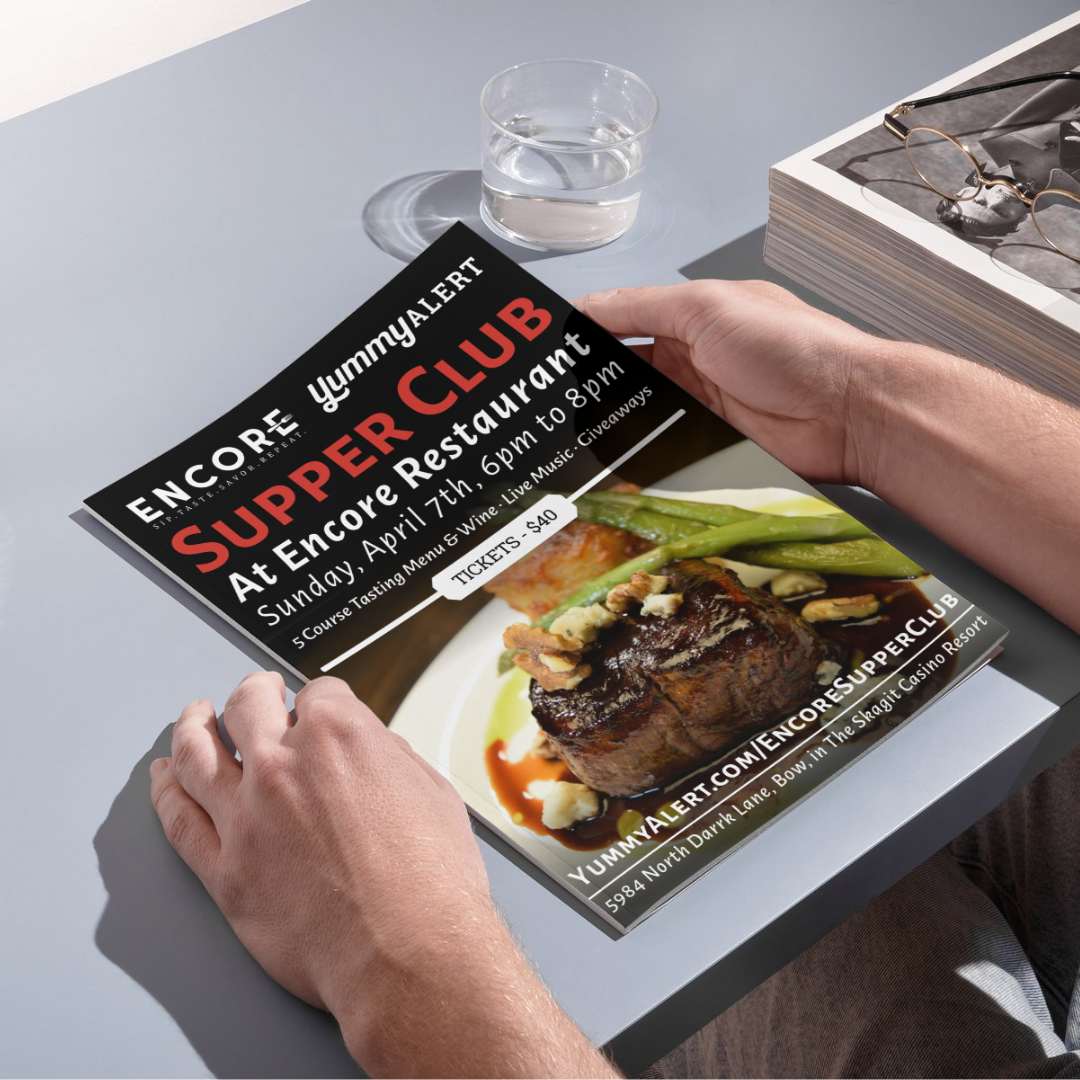 This flyer design for Yummy Alert and Encore's Supper Club events perfectly encapsulates their gourmet style with a big picture of the Osso Bucco from Encore Restaurant. The bold text styles grab your attention, catching passerbys attention to the flyers.